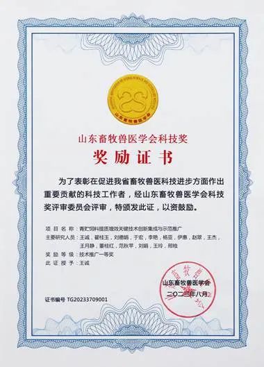 發(fā)布時(shí)間:[2023-9-18 14:34:45] 瀏覽量:5112次該獎(jiǎng)項(xiàng)由山東畜牧獸醫(yī)學(xué)會(huì)設(shè)立,根據(jù)《山東畜牧獸醫(yī)學(xué)會(huì)科技獎(jiǎng)獎(jiǎng)勵(lì)辦法(試行)》的規(guī)定,經(jīng)山東畜牧獸醫(yī)學(xué)會(huì)科技獎(jiǎng)勵(lì)工作委員會(huì)評(píng)審,對(duì)為我省畜牧獸醫(yī)事業(yè)科技進(jìn)步和創(chuàng)新做出突出貢獻(xiàn)的集體和個(gè)人給予的獎(jiǎng)勵(lì)。